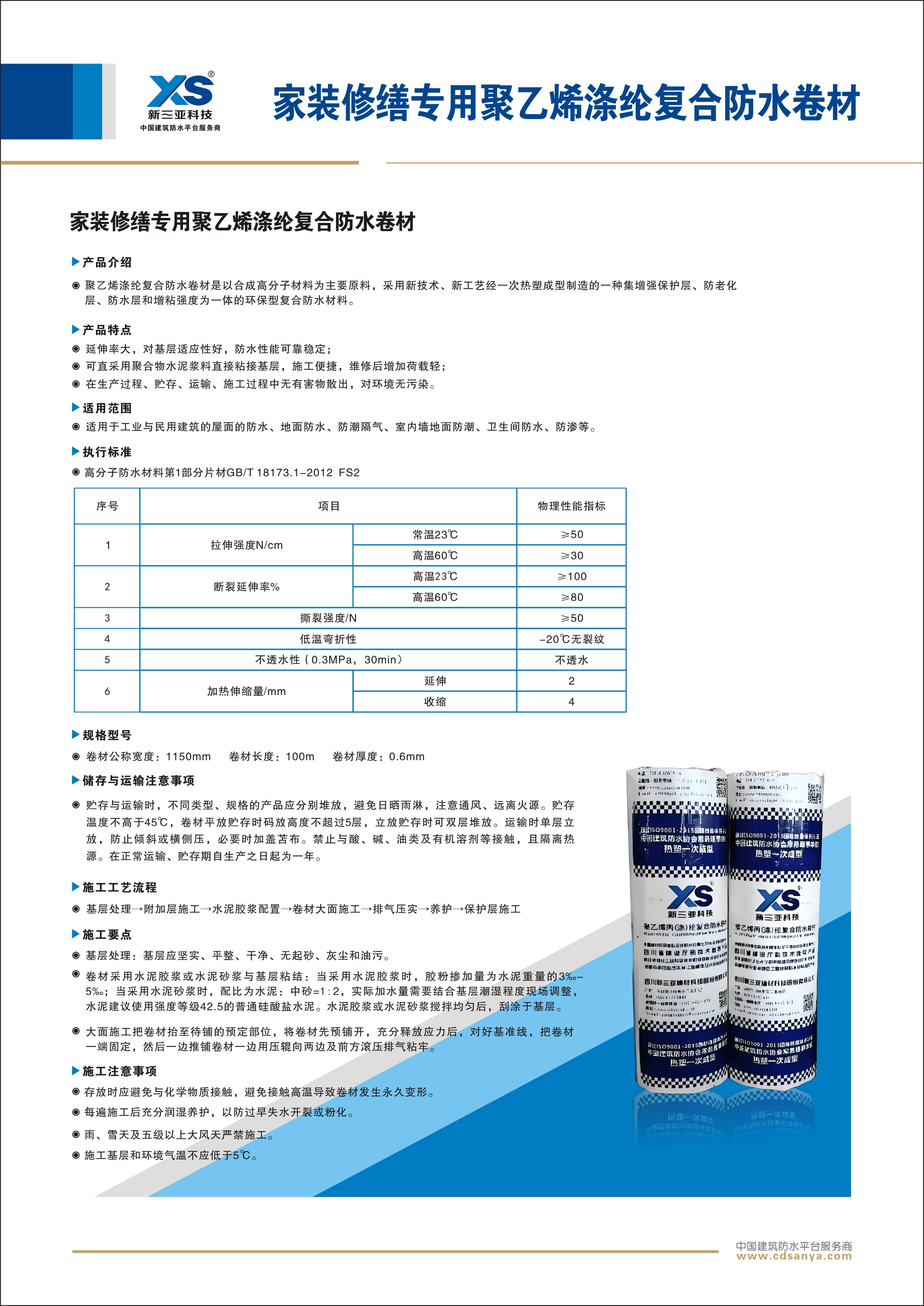 家裝修繕專用聚乙烯滌綸復合防水卷材是以合成高分子材料為主要原料,采用新技術、新工藝經(jīng)一次熱塑成型制造的一種集增強保護層、防老化層、防水層和增粘強度為一體的環(huán)保型復合防水材料。