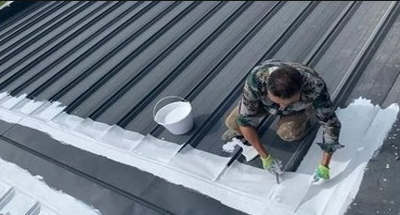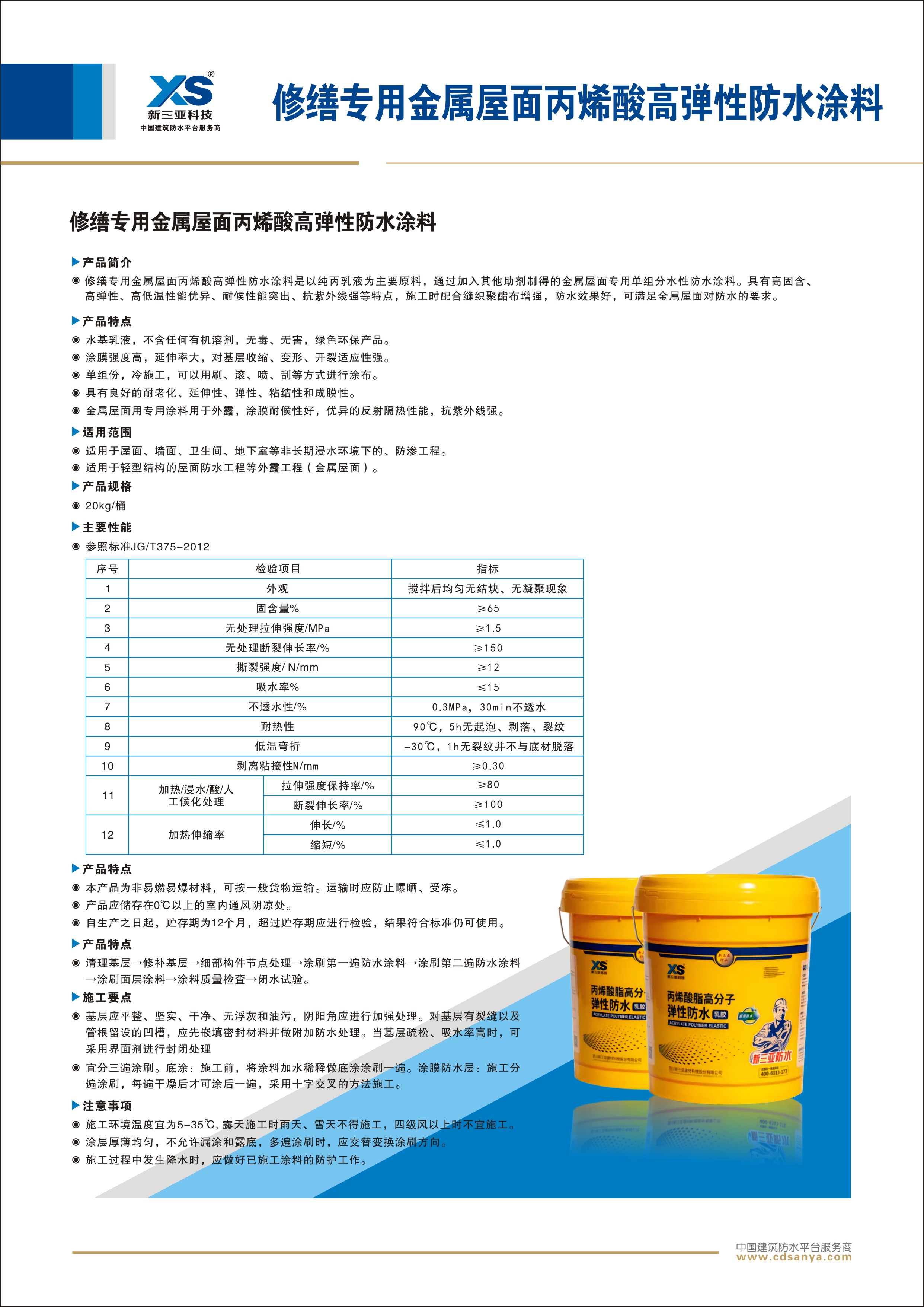 修繕專用金屬屋面丙烯酸高彈性防水涂料是以純丙乳液為主要原料,通過加入其他助劑制得的金屬結構專用單組分水性防水涂料。具有高固含、高彈性、高低溫性能優(yōu)異、耐候性能突出、抗紫外線強等特點,施工時配合縫織聚酯布增強,防水效果好,可滿足金屬屋面對防水的要求。